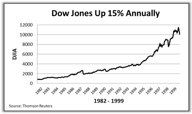 The annual rate of return on the DJIA was over 15% during the 1982-2000 market advance. The Dow went from 875 to 11,497—cumulatively an increase of over 1,200%. So investors that invested solely in the stock market increased their net worth twelvefold! Total return including dividends was 18% per year. What a run for nearly twenty years! Recall that in average or “normal” times, stocks deliver total returns of 10-11% annually.