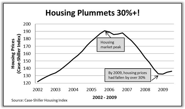 The most often used indicator of the housing market is the Case Shiller Housing Index. It shows that housing prices declined over 30% in 2007-2009, erasing virtually all the buildup from the 2002-2006 four-year increase. It was a steady three-year retreat.