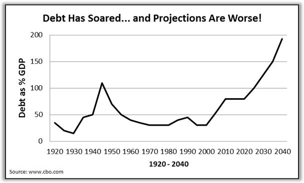As with the prior chart on deficits, debt is also best analyzed as percent of GDP. For over 200 years of our great nation’s history, with the 1940s defense of capitalism being the exception, we maintained our debt levels at a manageable 25-45% of GDP. So let’s center on 35%.
