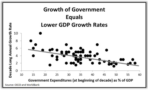 Each dot represents a ten-year period of economic growth of a single country and the size of government for that same country at the start of the decade. The observations tell us, collectively through using a multiple regression analysis, that there is a downward sloping line, which illustrates that as government gets larger, GDP growth slows. Thus, the quality of our lives does not increase as government gets larger. It actually decreases! This is a really important concept!