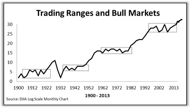 The stock market has returned approximately 10% per year, but you may notice from the above chart, there are eras of immaterial advances called “trading ranges,” followed by periods of material advances associated with bull markets. Sideways markets typically last 18 to 19 years, taking their time “making a base,” and then head off to the races. And they go for a few decades, with annual rates of return at approximately 15% or more. This is as real as it gets when talking about how means (averages) are formed—they rarely are represented but instead have periods far from the mean on both sides.